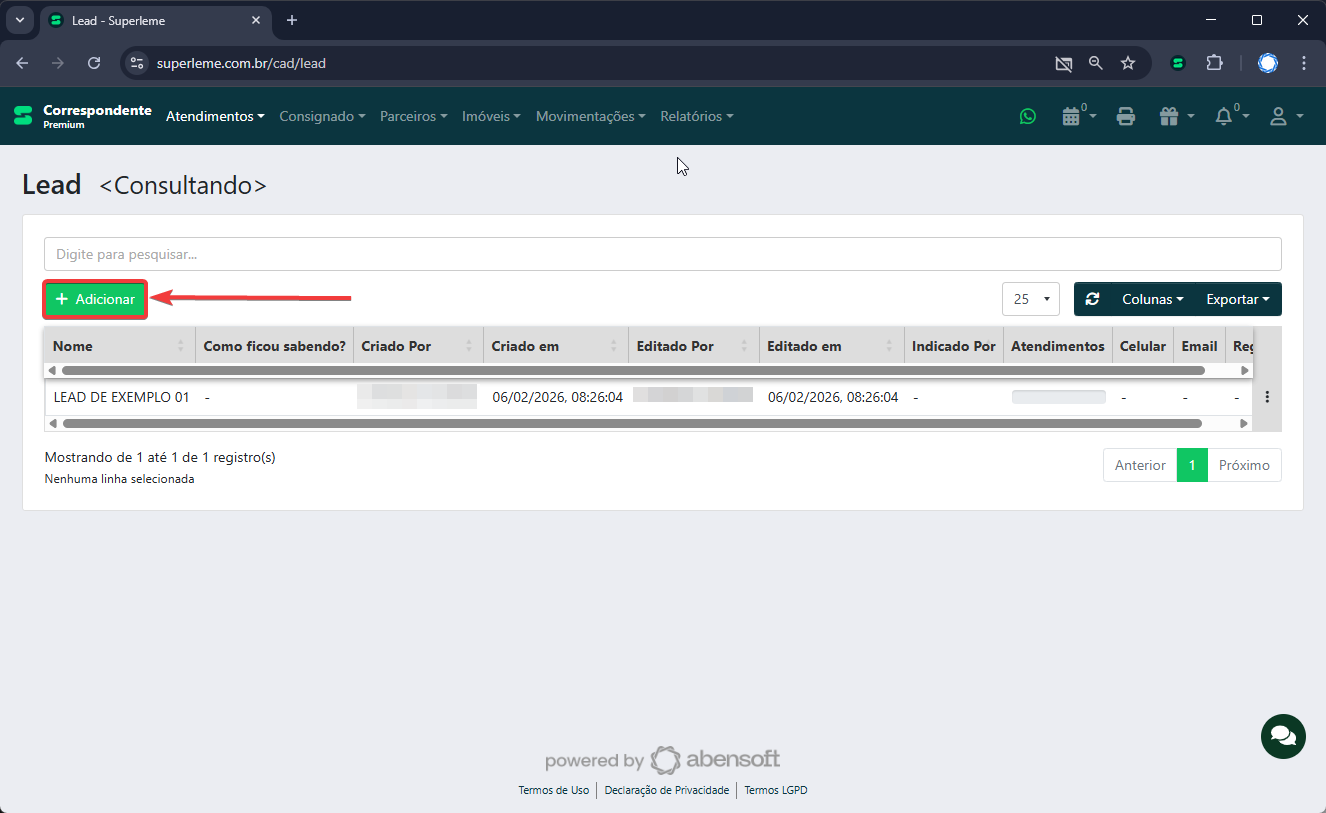 2 - Para cadastrar um Lead você deve clicar em + Adicionar. Na tela que será aberta, você pode verificar que o único campo obrigatório é o Nome* do Lead. Clicando em salvar, já será possível observar o Lead na lista de Leads.